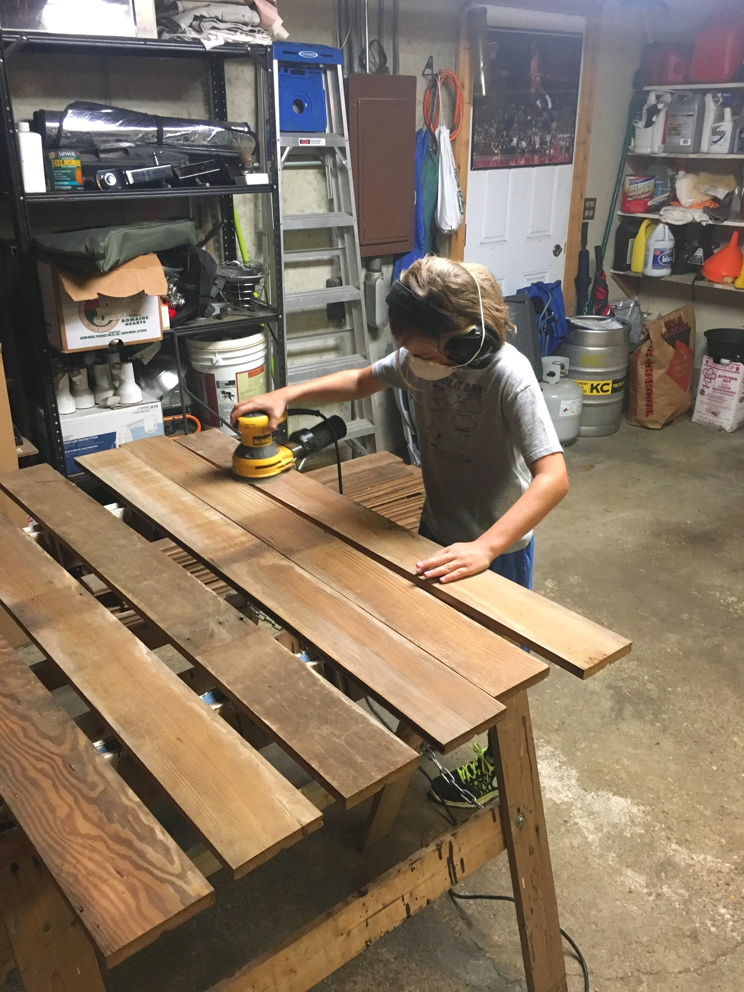 Ryan’s son, Evan, sanding family heirloom barn wood for the cladding of the Highwood bar.