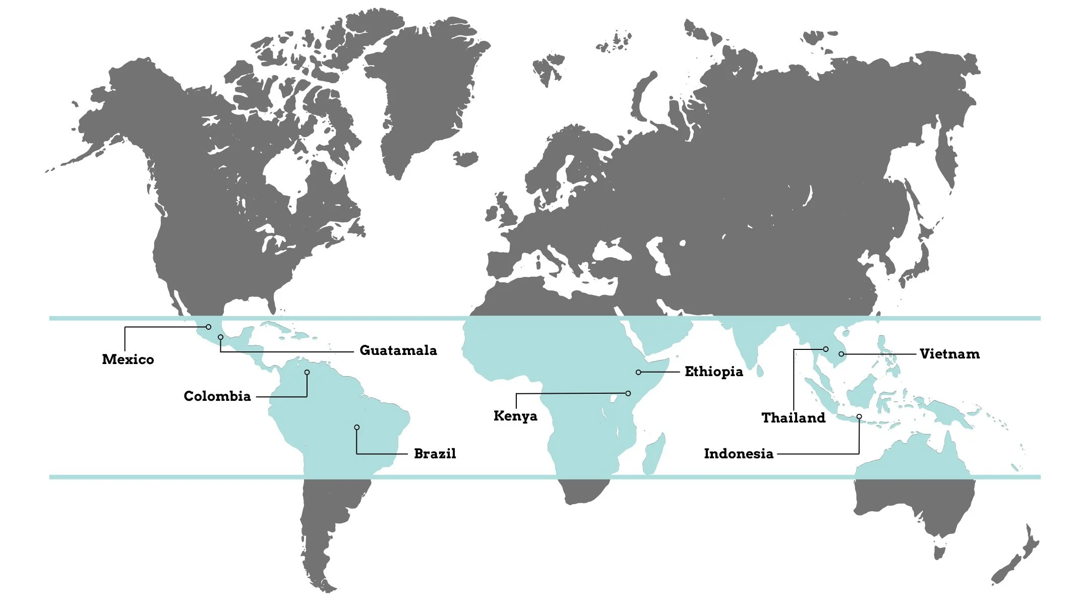 Coffee, much like many other plants, requires a specific climate to thrive—particularly the warm and humid conditions of the tropics. This ideal coffee-growing region, known as the "coffee bean belt," spans between 25 degrees north and 30 degrees south of the equator. The belt encompasses three major coffee-producing regions: Central and South America, Africa, and Southeast Asia.